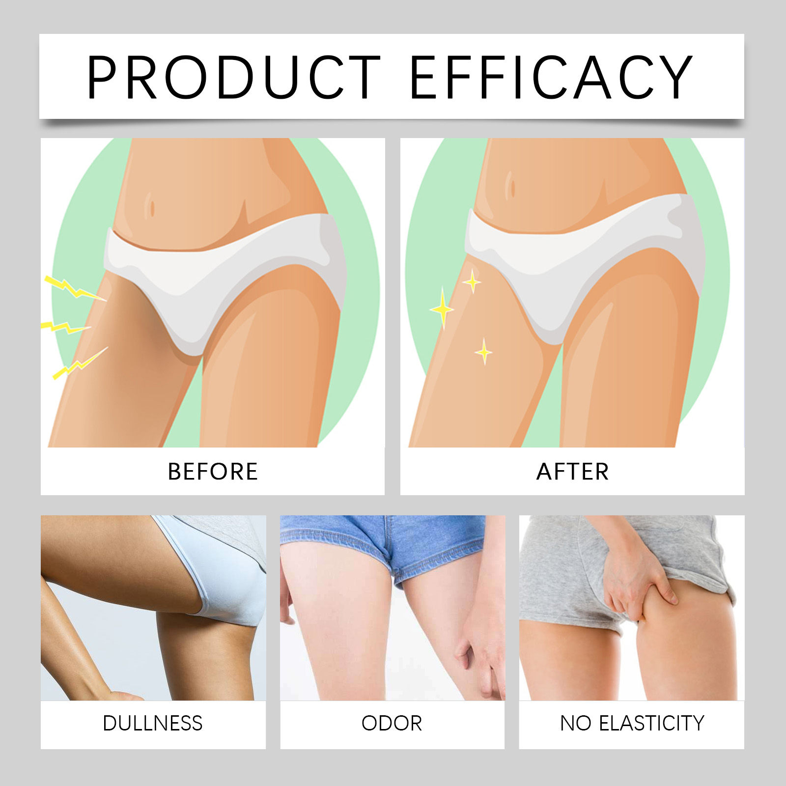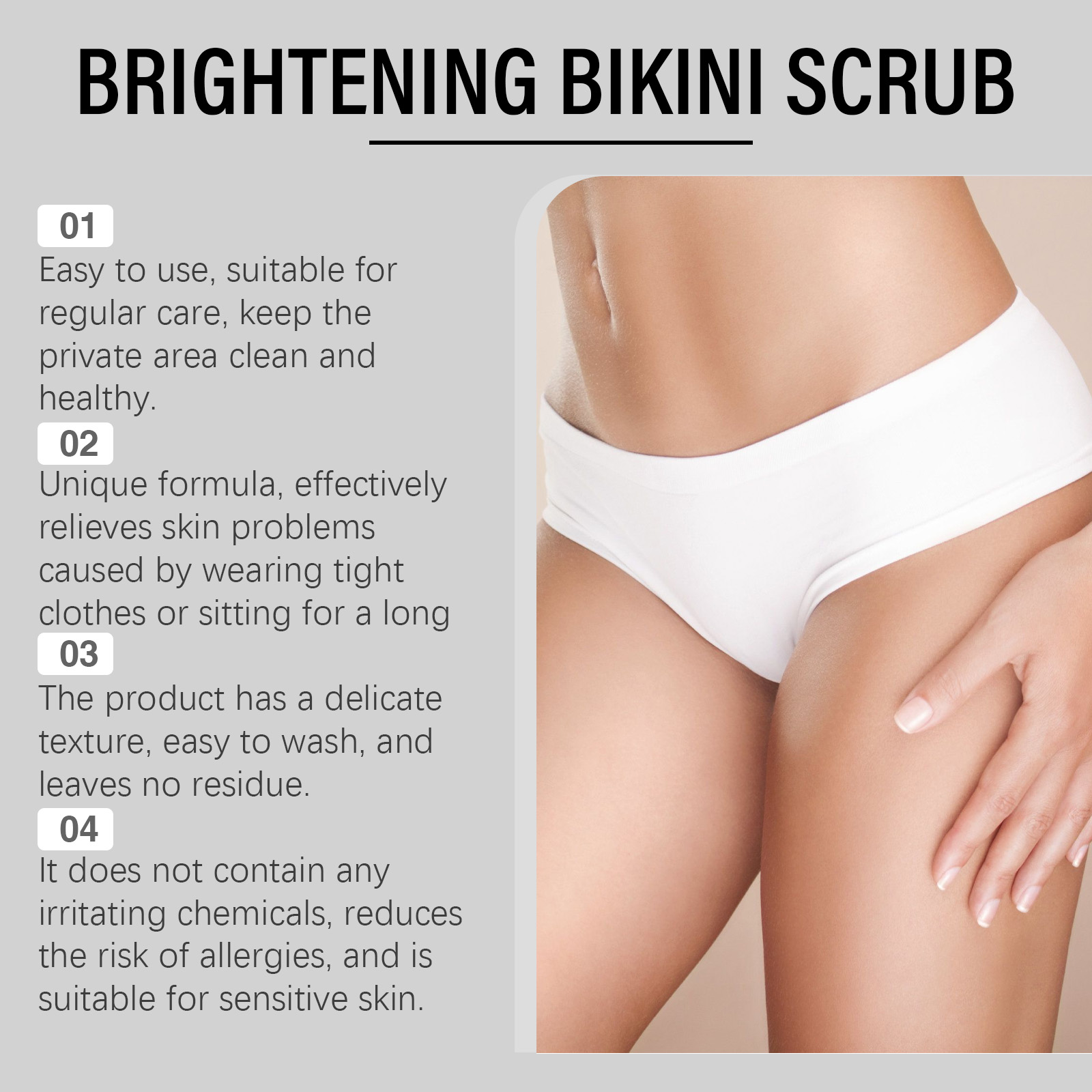 Our body scrubs contain ascorbic acid (vitamin C), glycerin. It can effectively improve the uneven skin tone of the private parts and make the skin bright. Its application method is very simple: moisturize the skin, apply appropriate amount of this product evenly on the skin of the bikini line, gently massage in circular motion for 3 minutes, and then rinse off with warm water. And designed for intimate skin, gentle and effective.